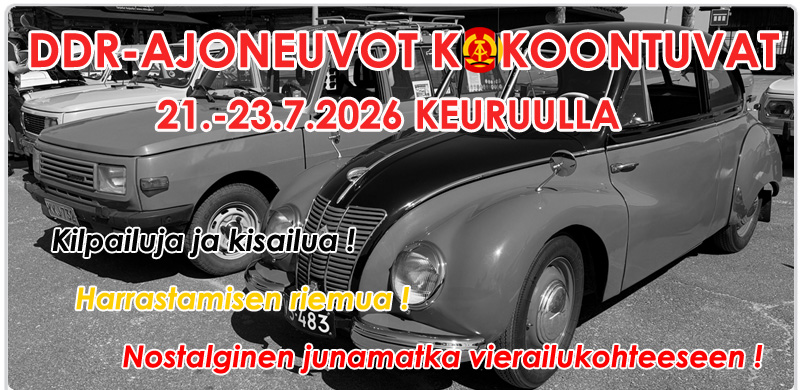 | Tervetuloa kurkistamaan menneisyyden pyörteisiin DDR-ajoneuvot kokoontuvat -tapahtumassa! Kyseessä on todellinen DDR-kulkupelien Woodstock, joka järjestetään Keuruun Nyyssänniemessä 21.-23.7.2026. Tähän seikkailuun osallistumiseen et tarvitse passia, viisumia tai valuutanvaihtoa - riittää että saavut paikalle hyvällä fiiliksellä! Ota siis suunnaksi Keuruu ja valmistaudu tapahtumaan, jossa historia pärisee, pellit helisevät ja hymy on herkässä. Nähdään Nyyssänniemessä! | ||